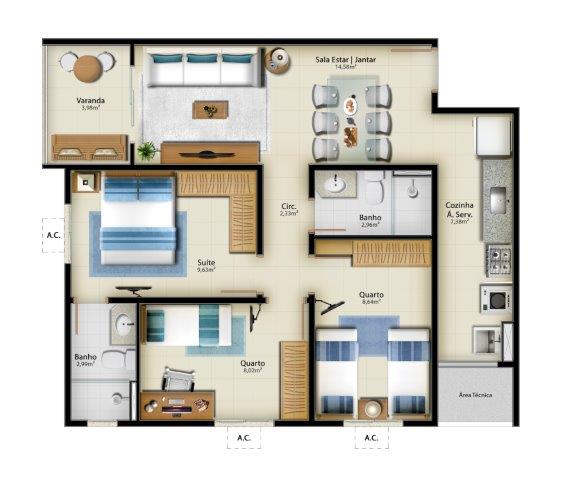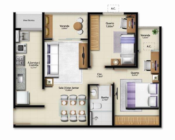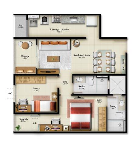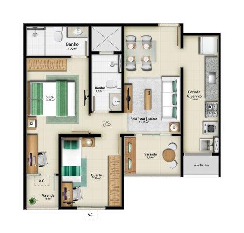 2 torres, com apartamentos de 1 quarto, 2 quartos, 2 quartos com suíte e 3 quartos com suíte. 158 apartamentos, sendo: 18 apartamentos de 01 quarto com 35,92 m²; 36 apartamentos de 2 quartos com 53,39 a 54,45m²; 70 apartamentos de 02 quartos com suíte com 57,84 a 62,23 m²; 34 apartamentos de 3 quartos com suíte com 71,22 m²; e garagens com 1 ou 2 vagas. Área de lazer montada e decorada.